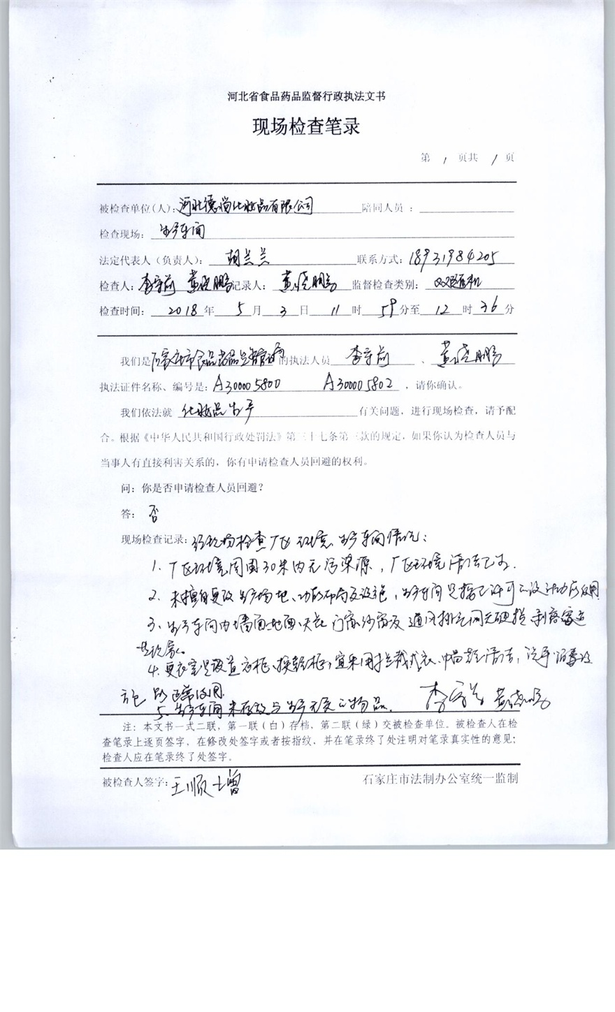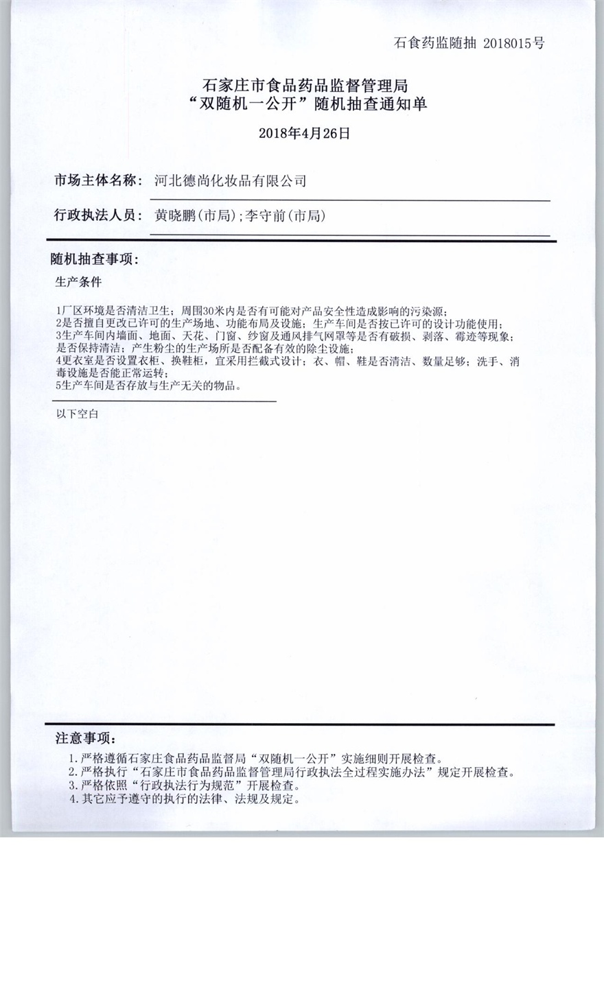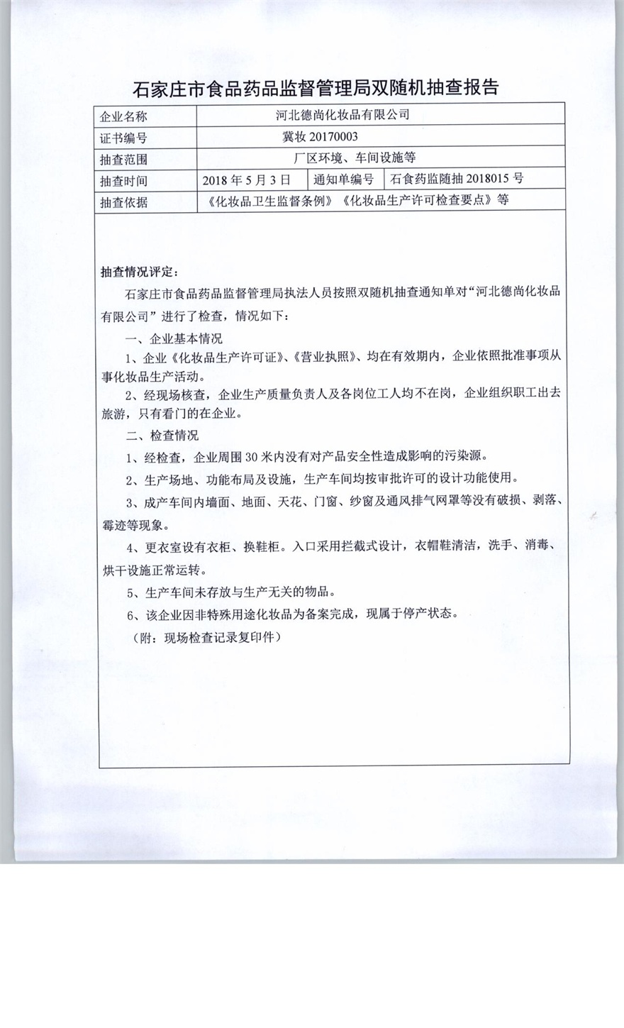 河北德尚化妆品有限公司双随机抽查报告(石食药监随抽2018015号)