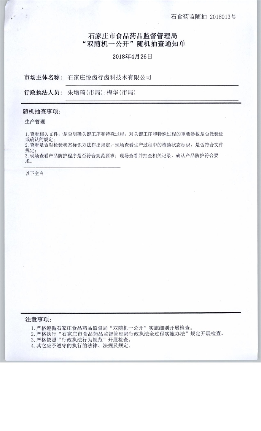 石家庄悦齿行齿科技术有限公司双随机抽查报告