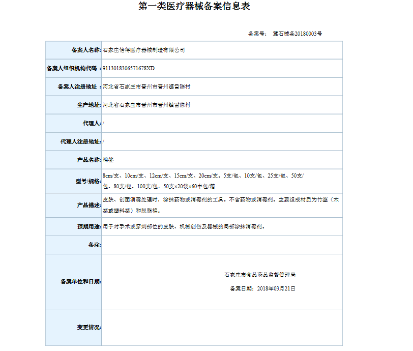 | 第一类医疗器械备案公告(2018年3月) 发布时间:2018年04月08日 2018年3月,我局共备案医疗器械产品4个;变更备案医疗器械产品2个;取消备案医疗器械产品9个。(具体备案情况见附件) 特此公告。 附件1:2018年3月备案第一类医疗器械产品目录及备案信息 附件2:2018年3月备案第一类医疗器械变更产品目录及变更信息 附件3:2018年3月备案第一类医疗器械取消产品目录 附件1 2018年3月备案第一类医疗器械产品目录
