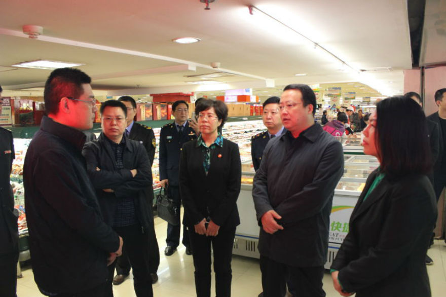为深入实地指导石家庄市创建国家食品安全示范城市有关工作的开展,4月14日,石家庄市委副书记、常务副市长税勇一行检查了北国先天下超市食品安全管理及食品快速检测室建设情况。税勇同志对超市食品安全监管寄予厚望,对食品快速检测室规范运行提出更高要求。石家庄市政府秘书长孟胜林,石家庄市食品药品监督管理局局长崔芸以及长安区有关领导同志陪同检查。