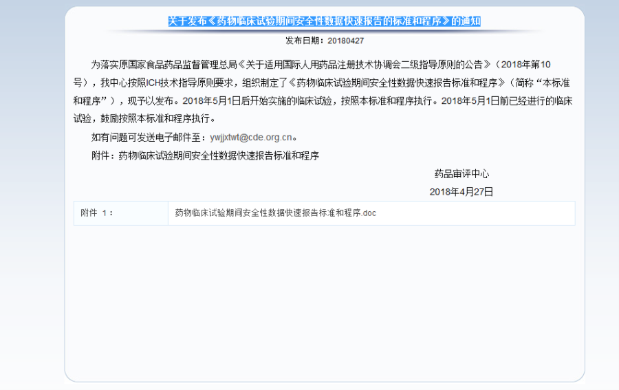 关于发布《药物临床试验期间安全性数据快递报告的标准和程序》的通知