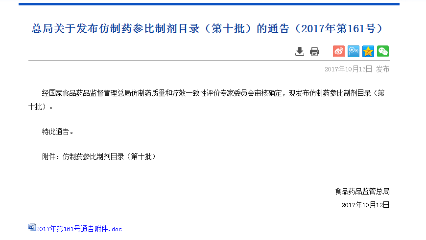 总局关于发布仿制药参比制剂目录(第十批)的通告(2017年第161号)