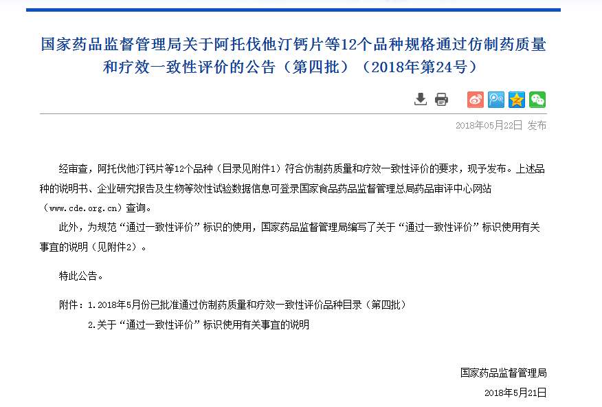 国家药品监督管理局关于阿伐他汀钙片等12个品种规格通过仿制药质量和疗效一致性评价的公告(第四批)(2018年第24号)