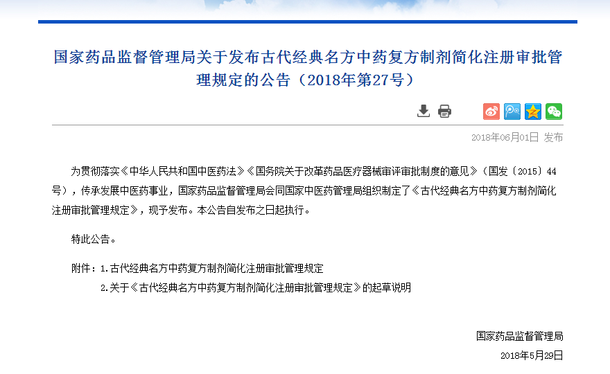 国家药品监督管理局关于发布古代经典名方中药复方制剂简化注册