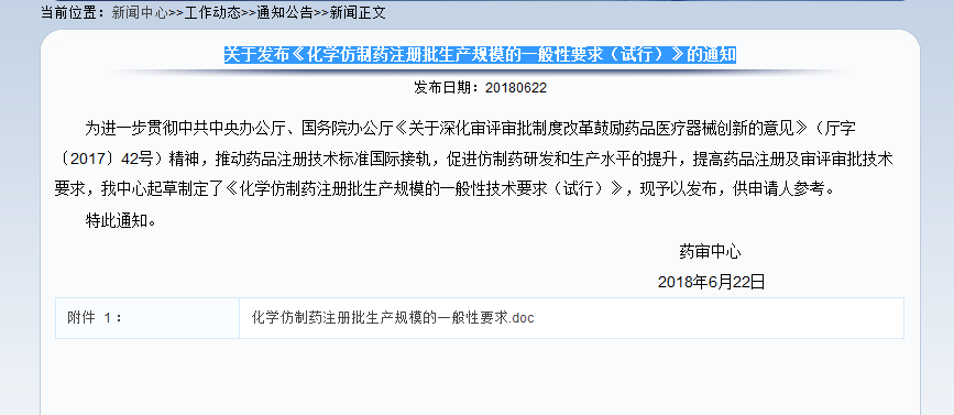 关于发布《化学仿制药注册批生产规模的一般性要求(试行)》的通知